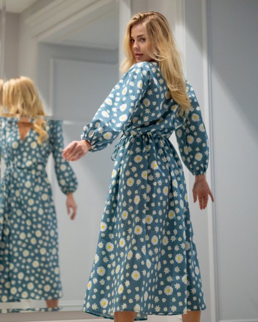 Яркое и стильное платье с запахом свободного кроя с длинными рукавами-фонариками на резинке.