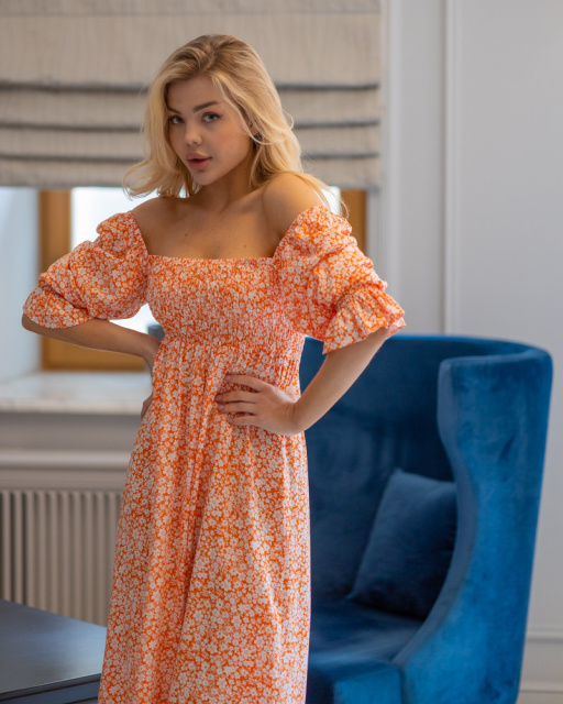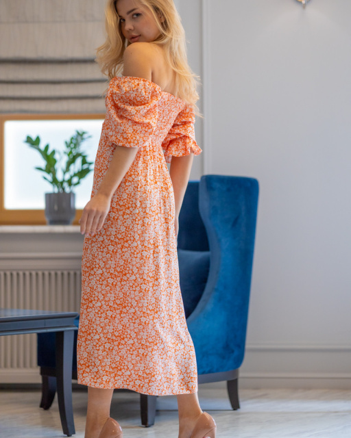 Яркое летнее платье-миди с рукавами-фонариками и резинкой на груди.