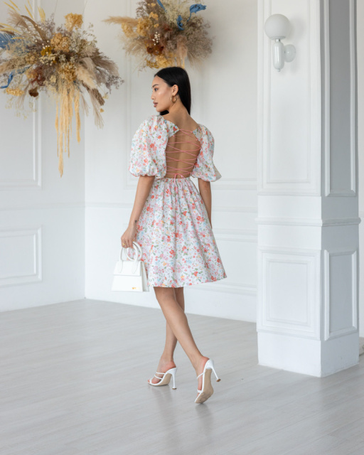 Модель стилизована пышными рукавами-фонариками и тоненькой шнуровкой на спине, которая имитирует корсет и подчёркивает фигуру. Крой юбки позволяет чувствовать себя свободно и подходит на любой объём бёдер.