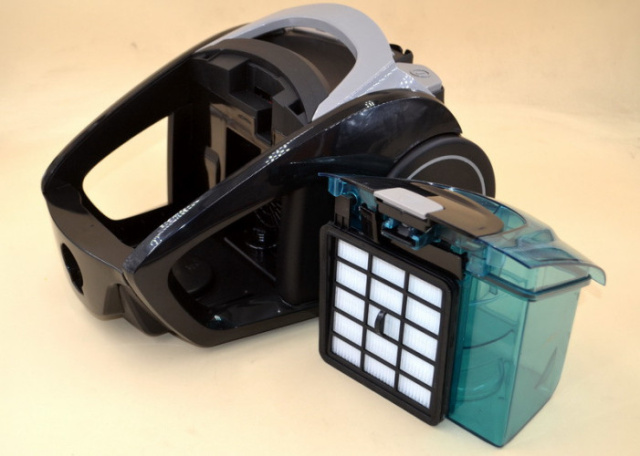 Мусор в итоге попадает в предназначенный для него съемный контейнер, а воздух проходит через моторный блок, через фильтр и возвращается в помещение