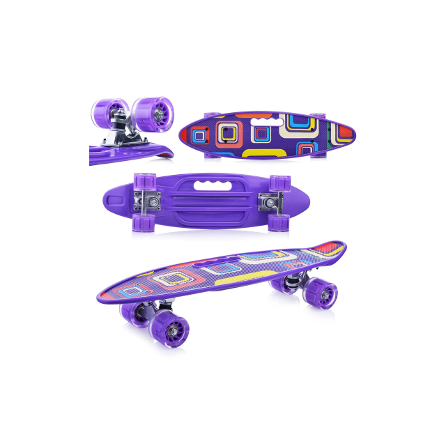 Пенни Борд Penny Cruiser с ручкой предназначен для детей с массой до 60 кг и предлагает универсальное применение как в городских условиях, так и для освоения простых трюков. Он оснащен прочной и легкой пластиковой доской с ярким принтом, обладает специальным рельефным рисунком для предотвращения скольжения ног и удобным вырезом для переноски. Характеристики: Размеры скейта: 58.5х16х10 см Яркий принт Прочная и легкая пластиковая дека Вырез в деке для удобства переноски Рельефный рисунок на деке Материал подвески: прочный алюминий Регулирование жёсткости подвески Диаметр колёс: 58 мм Светящиеся колёса из полиуретана Класс подшипников: ABEC-7 Максимальная нагрузка: 60 кг