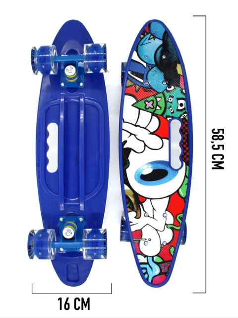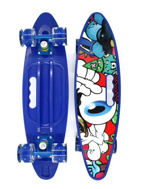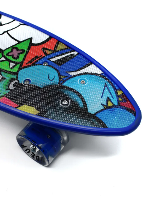 Пенни Борд Penny Cruiser с ручкой предназначен для детей с массой до 60 кг и предлагает универсальное применение как в городских условиях, так и для освоения простых трюков. Он оснащен прочной и легкой пластиковой доской с ярким принтом, обладает специальным рельефным рисунком для предотвращения скольжения ног и удобным вырезом для переноски. Характеристики: Размеры скейта: 58.5х16х10 см Яркий принт Прочная и легкая пластиковая дека Вырез в деке для удобства переноски Рельефный рисунок на деке Материал подвески: прочный алюминий Регулирование жёсткости подвески Диаметр колёс: 58 мм Светящиеся колёса из полиуретана Класс подшипников: ABEC-7 Максимальная нагрузка: 60 кг