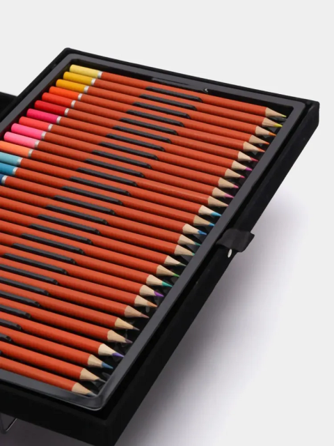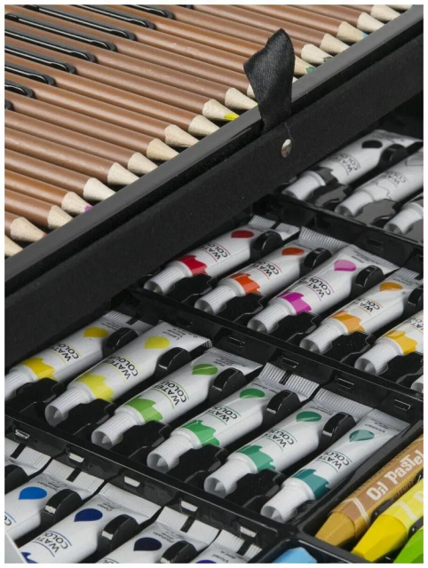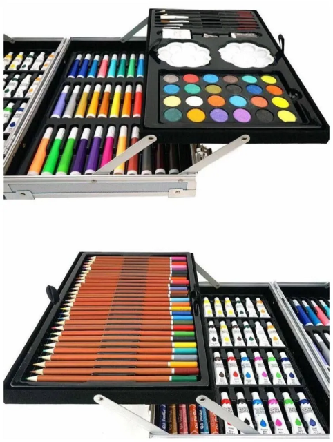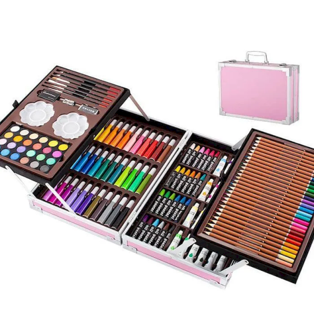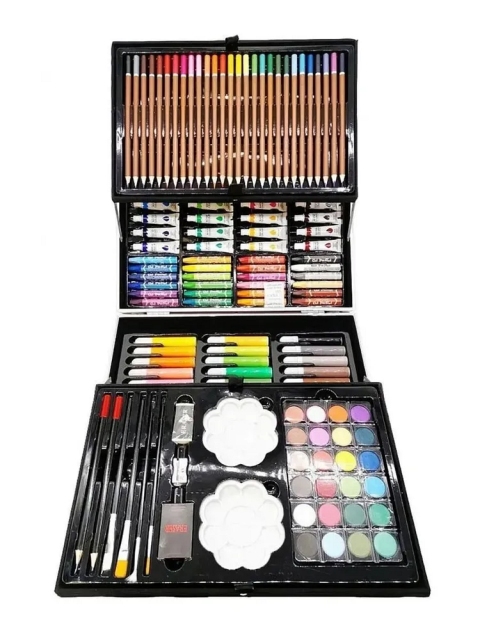 В нашем наборе есть все необходимое для занятия любимым делом, а именно 145 предметов: цветные карандаши, акварельные краски, восковые мел, маркеры, канцелярские принадлежности и многое другое. Художественный набор в чемоданчике на 145 предметов идеальный подарок как для детей, так и для подростков.
