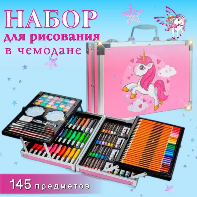 Набор для рисования "Единорог" на 145 предметов в чемоданчике. Детский набор для творчества