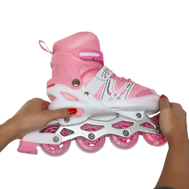 Представляют собой удобную опцию для фитнес-катания. Они обладают кнопочной системой регулировки на 4 размера с раздвижным механизмом Push&Pull, что обеспечивает простое и удобное настройка размера. Ботинок выполнен из мягкого сетчатого материала, обеспечивая комфорт и дышащесть во время катания. Светящиеся колеса, система подшипников ABEC 7, классическая система шнуровки, бакля и пяточный ремень делают эти коньки универсальными и функциональными.