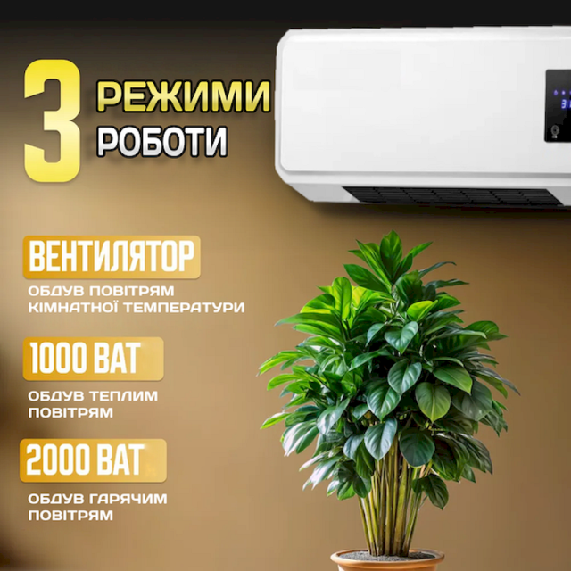 3 режима работы: просто вентилятор (без нагрева), обогрев с мощностью 1000 Вт и 2000 Вт;
