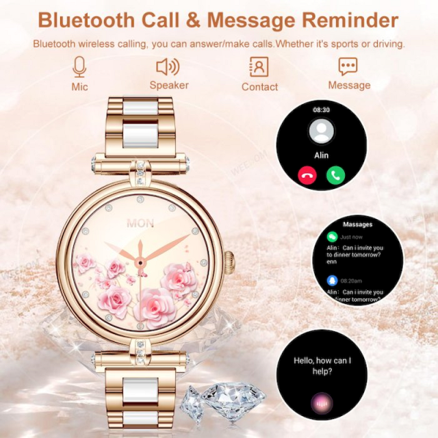Smart Leila - элегантные смарт-часы для женщин. Они сочетают стильный дизайн с умными функциями, помогающими следить за здоровьем и оставаться на связи. Часы имеют яркий дисплей, удобный интерфейс, более 100 спортивных режимов, позволяют получать уведомления, управлять музыкальным плеером и персонализировать заставки. Это идеальный аксессуар для тех, кто ценит сочетание моды и технологий.