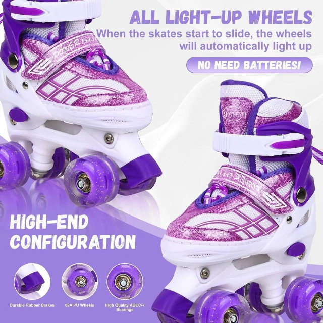 Роликовые коньки четырехколесные раздвижные с регулируемым размером (Квады) S (31-34) 104 S Размерность - Кнопочная система регулировки на 4 размера S (31-34) Ботинок: искусственная кожа в сочетании с мягкими сетчатыми материалами Тормоз: Передний (на обоих ботинках) Размер: раздвижной регулируемый 3-уровневые застёжки: пряжка, ремень и шнуровки Рама: пластик Подшипники: ABEC 7 Колеса: ПУ (полиуретан) - Светятся. Жесткость колес: 82А Диаметр колес: 70 мм Регулируемые и экономичные коньки: детские коньки имеют 4 регулируемых размера, идеальный выбор для растущих детей, экономичный выбор, нет необходимости покупать еще одни. Для регулировки размера следуйте инструкциям на изображении. Светящиеся расширенные колеса: подходят для занятий спортом в помещении и на открытом воздухе, имеют мигающий дизайн колес с разноцветными огнями, не требуют батареек, безопасны и прохладны ночью. Красочная подсветка колес также обеспечивает детям приятные ощущения от катания. Система множественной защиты: детские коньки оснащены прочной регулируемой пряжкой, ремешком на липучке и шнурками, прочным корпусом ботинка, обеспечивают хорошую поддержку и множественную защиту лодыжки вашего ребенка, а также легко надеваются, снимаются и регулируются. Конструкция переднего двойного тормоза помогает детям тормозить, когда им нужно остановиться, чтобы избежать столкновений с другими людьми. Дети легко могут удерживать равновесие, что значительно повышает безопасность и устойчивость. Очень подходит для начинающих и маленьких детей. Плавный и дышащий: оснащен подшипниками ABEC-7 и имеет контролируемую скорость для новичков, малышей и детей. Когда ваш ребенок впервые попробует их опробовать, вы можете затянуть колеса, чтобы они не катились слишком быстро. Расширенные полиуретановые колеса 82A обеспечивают безопасное и плавное скольжение. Мягкая и дышащая подкладка обеспечивает комфортную и прохладную езду. Идеальный товар для детей: хороший товар на день рождения, праздник, Рождество, Новый год или любой другой важный момент для девочек и мальчиков. Детские коньки также можно подарить в качестве награды или поощрения вашей дочери, племяннице, племяннику, внучке, это удивит и обрадует их. Искреннее обслуживание: мы предлагаем круглосуточное дружелюбное обслуживание клиентов. Если у вас возникнут какие-либо вопросы о нашем детском велосипедном шлеме перед покупкой или во время использования, сообщите нам об этом, и мы поможем вам, пока проблема не будет решена.